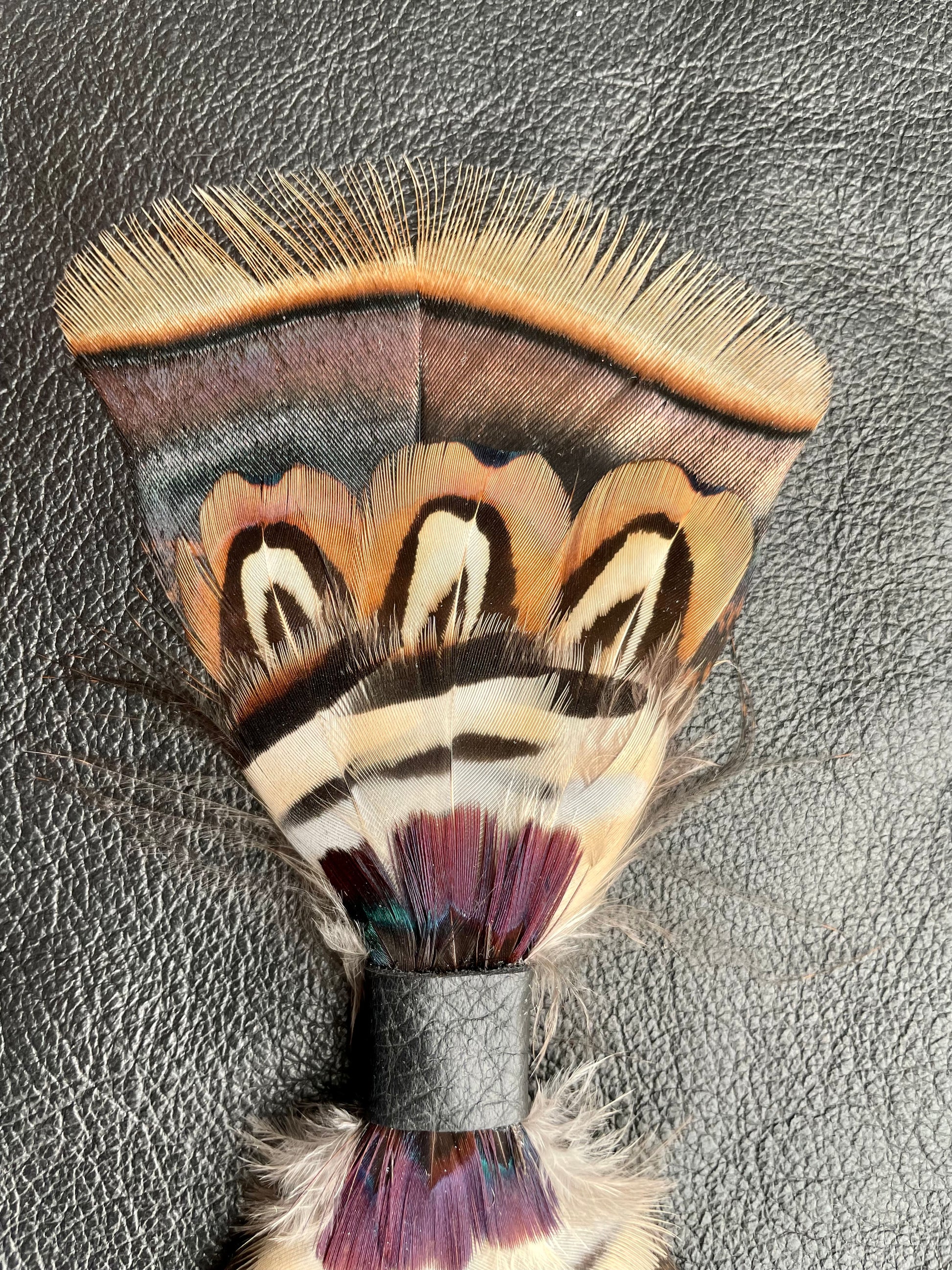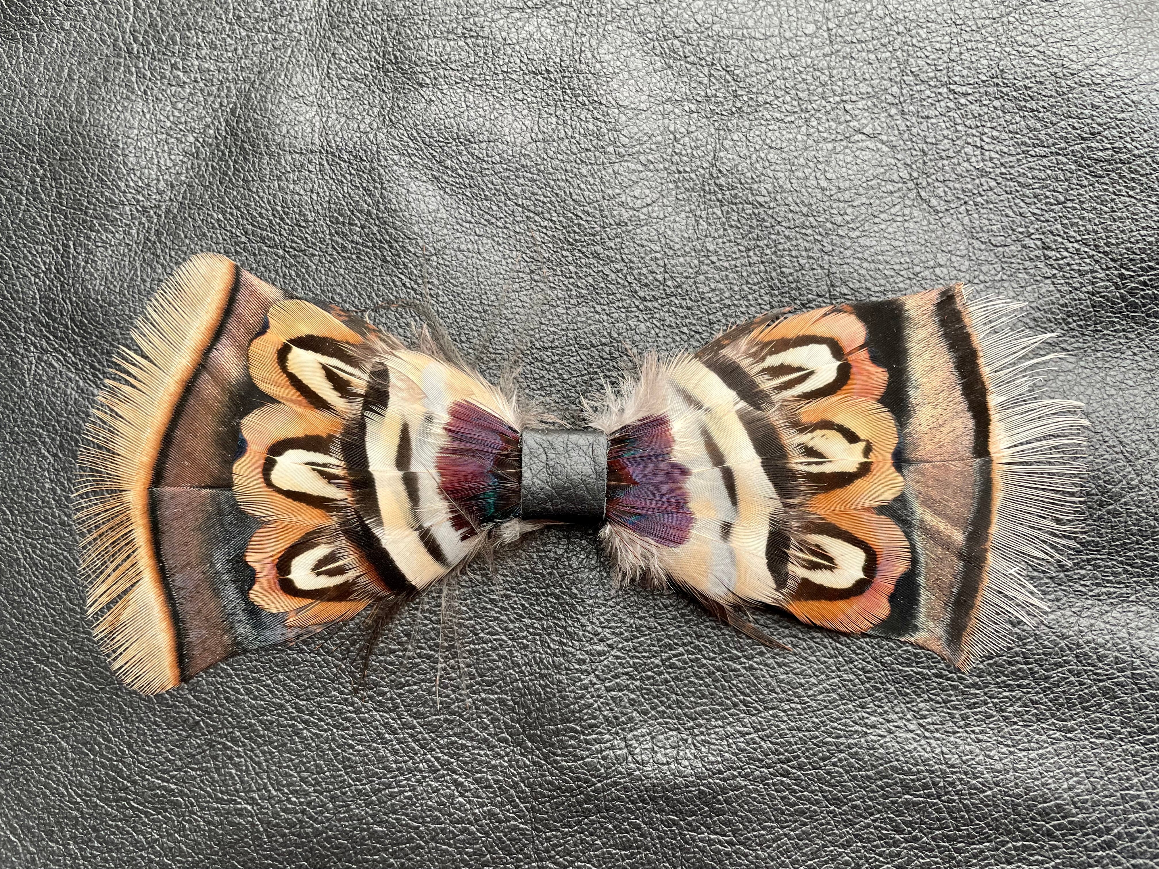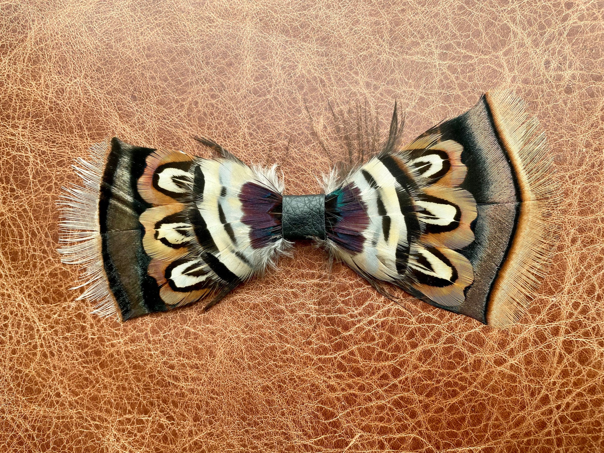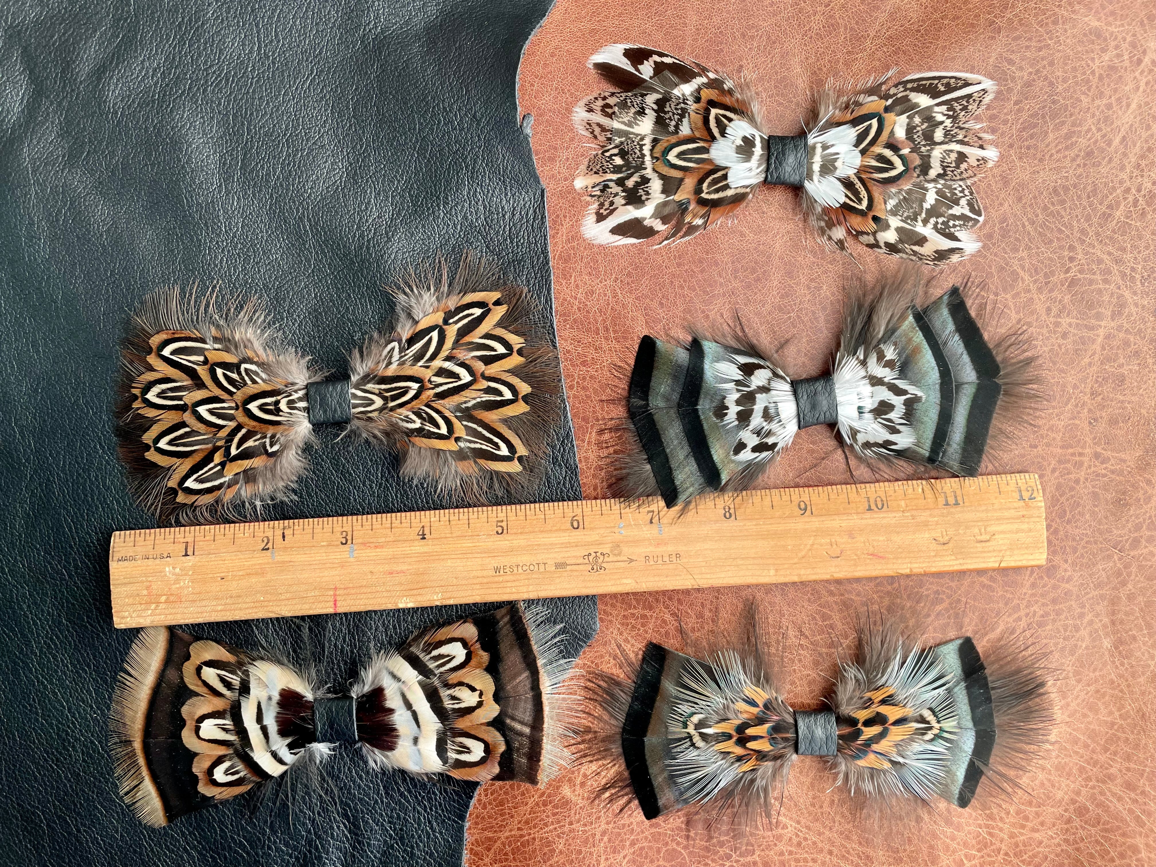 These hat bows are handcrafted in small batches. They are made of wild, ethically sourced game bird feathers. Including Turkey, Chukar, Pheasant, and a variety of Grouse species feathers. Every feather is unique and beautiful, boasting iridescent and neutral tones.