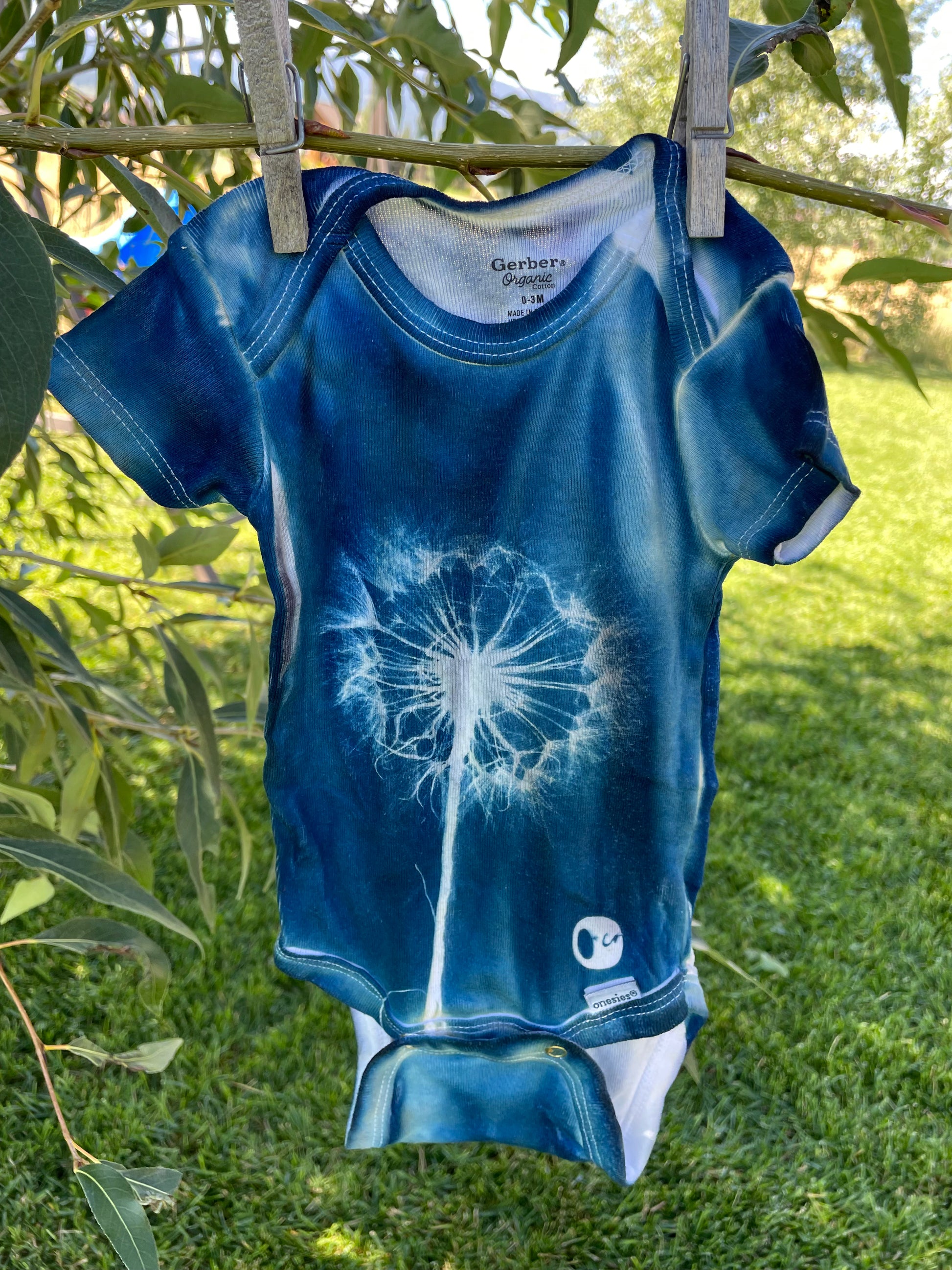 Caring for your clothing: Each cyanotype garment is unique and requires such care. Turn inside out and hand wash with cold water when necessary. Do not use soaps or detergents containing phosphates, high PH solutions, or bleach--these products can cause discoloration and fading. If needed, washing in a diluted bath of hydrogen peroxide can help restore to original blue.