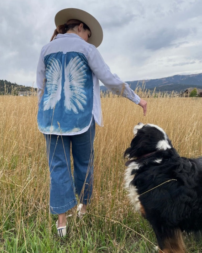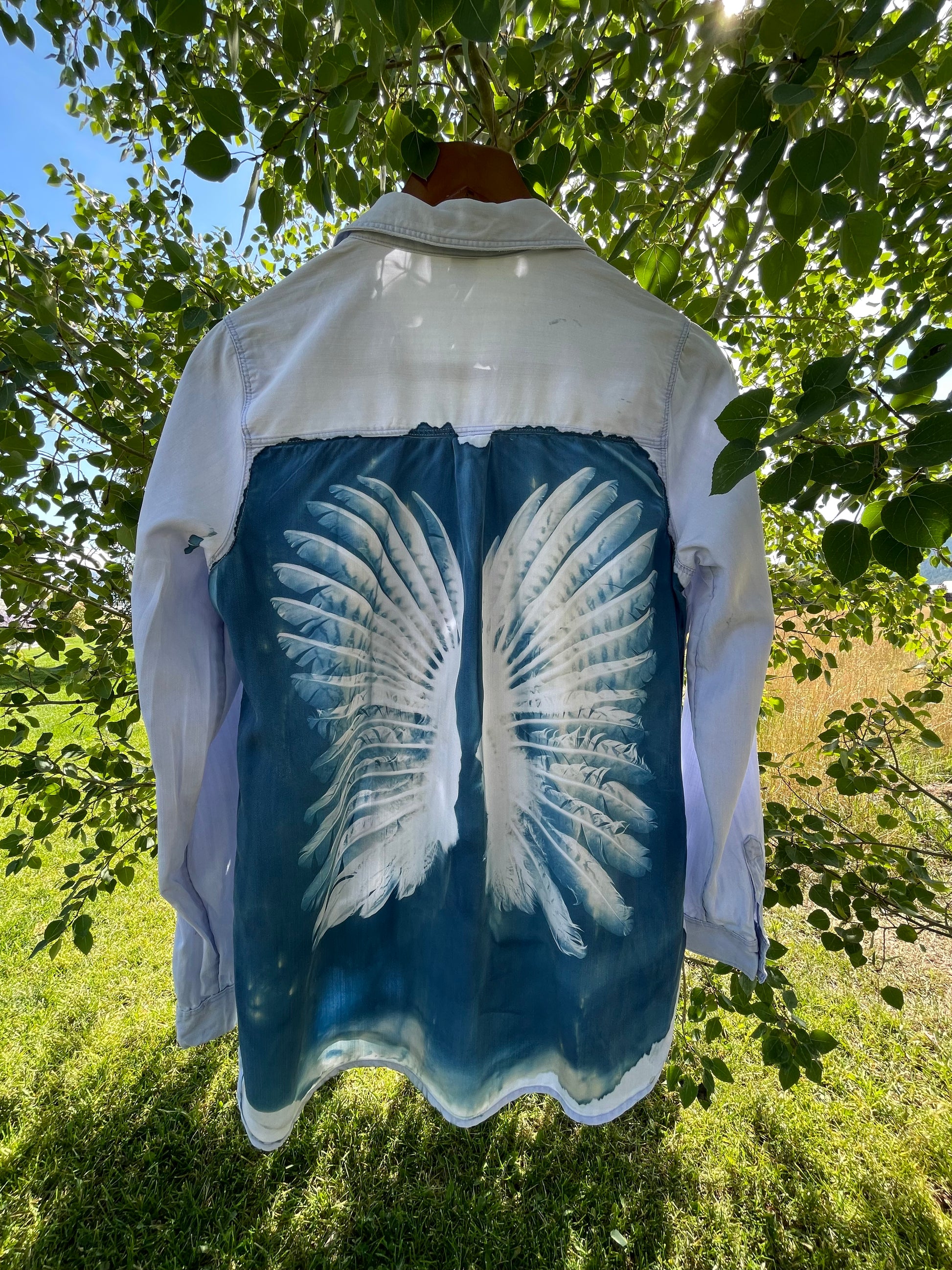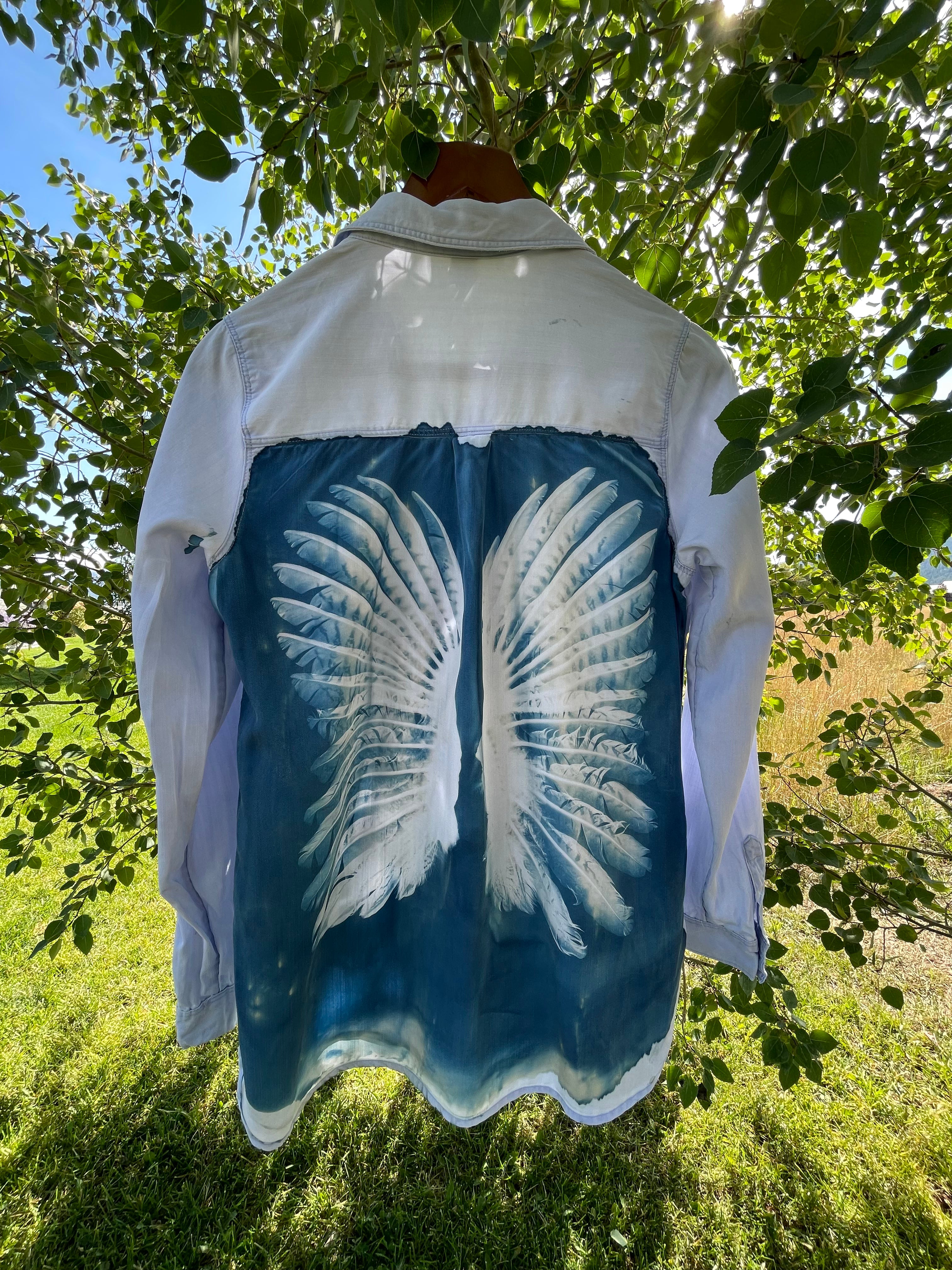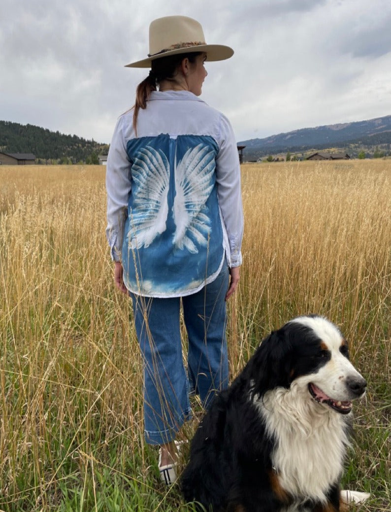 Secondhand fashion, redesigned using solar photography and beautiful wings of Wyoming. This garment is one of a kind, upcycled, and sustainable.
