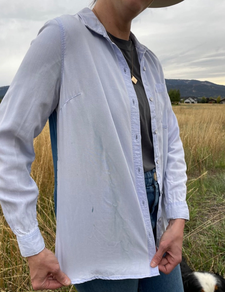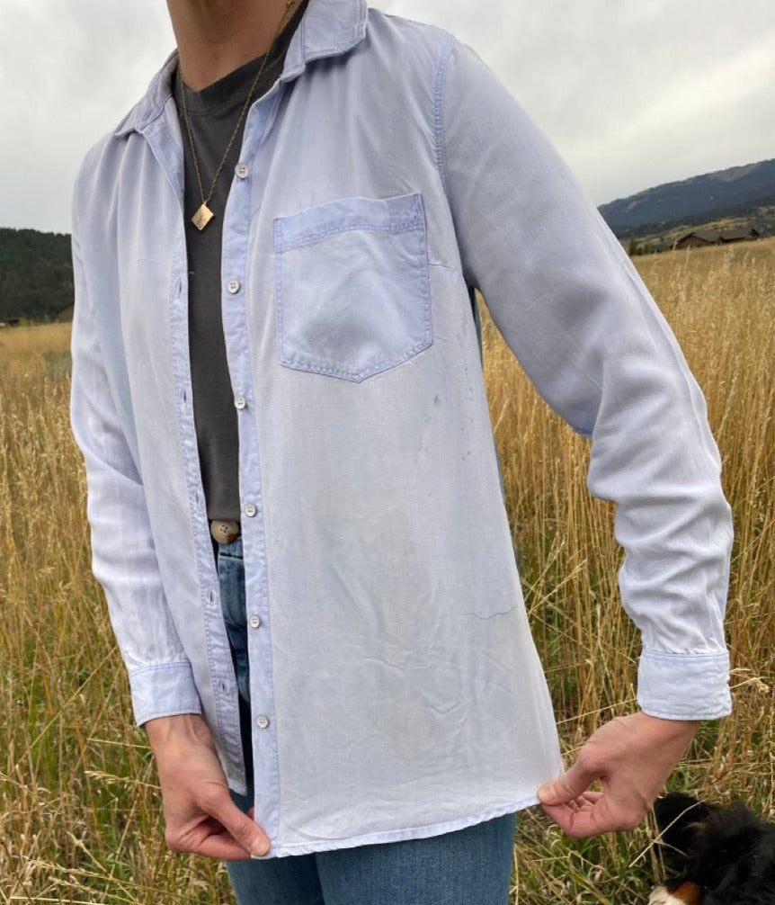 Caring for your clothing: Each cyanotype garment is unique and requires such care. Turn inside out and hand wash with cold water when necessary. Do not use soaps or detergents containing phosphates, high PH solutions, or bleach--these products can cause discoloration and fading. If needed, washing in a diluted bath of hydrogen peroxide can help restore to original blue.