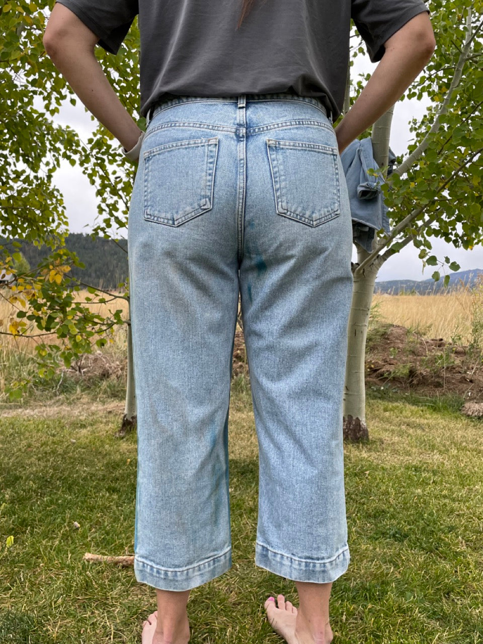 Caring for your clothing: Each cyanotype garment is unique and requires such care. Turn inside out and hand wash with cold water when necessary. Do not use soaps or detergents containing phosphates, high PH solutions, or bleach--these products can cause discoloration and fading. If needed, washing in a diluted bath of hydrogen peroxide can help restore to original blue.