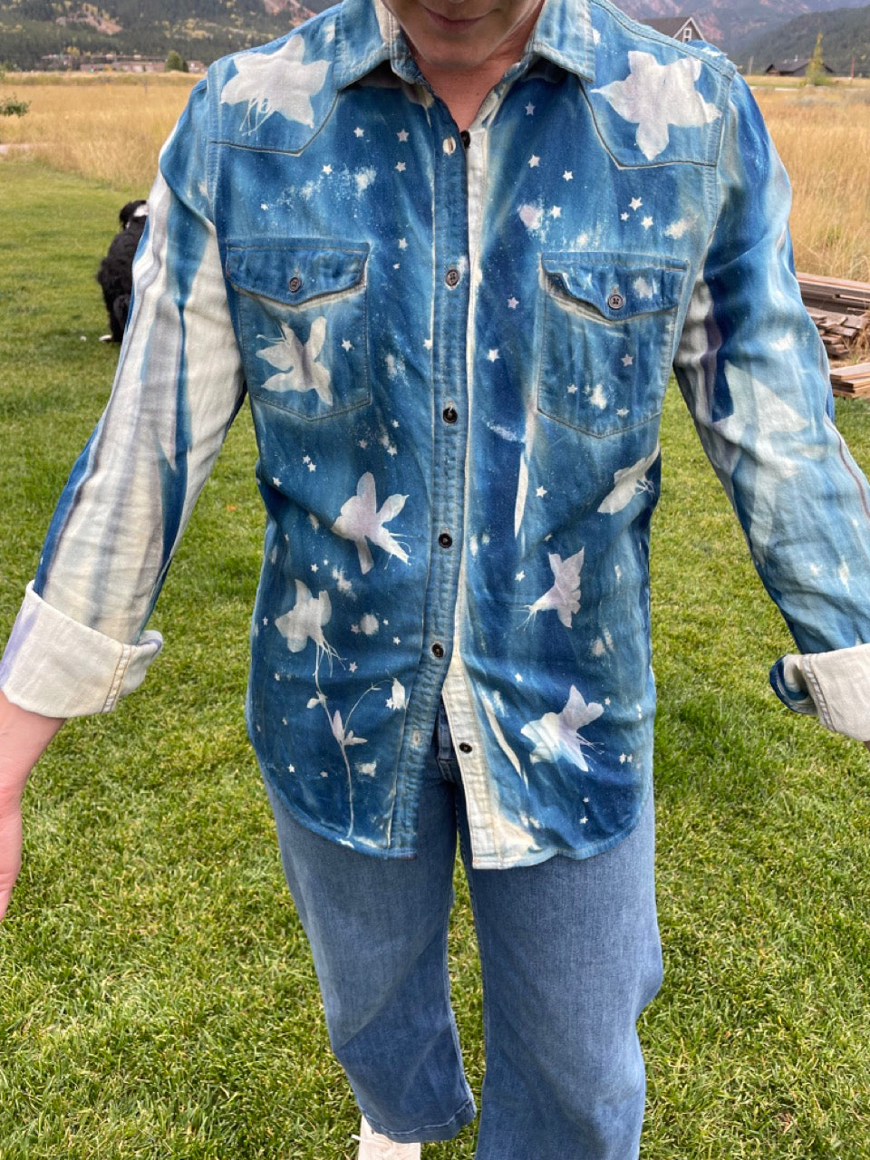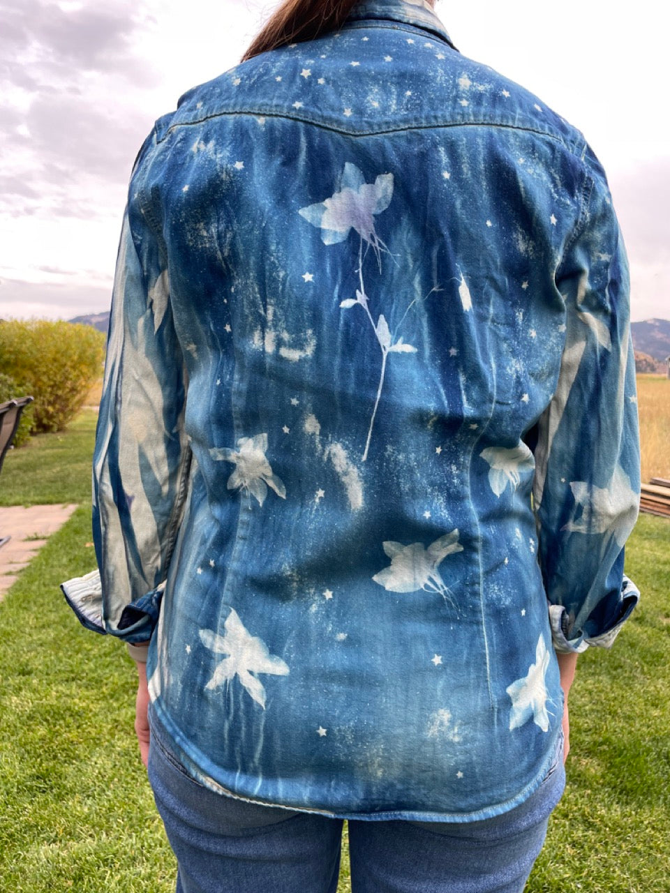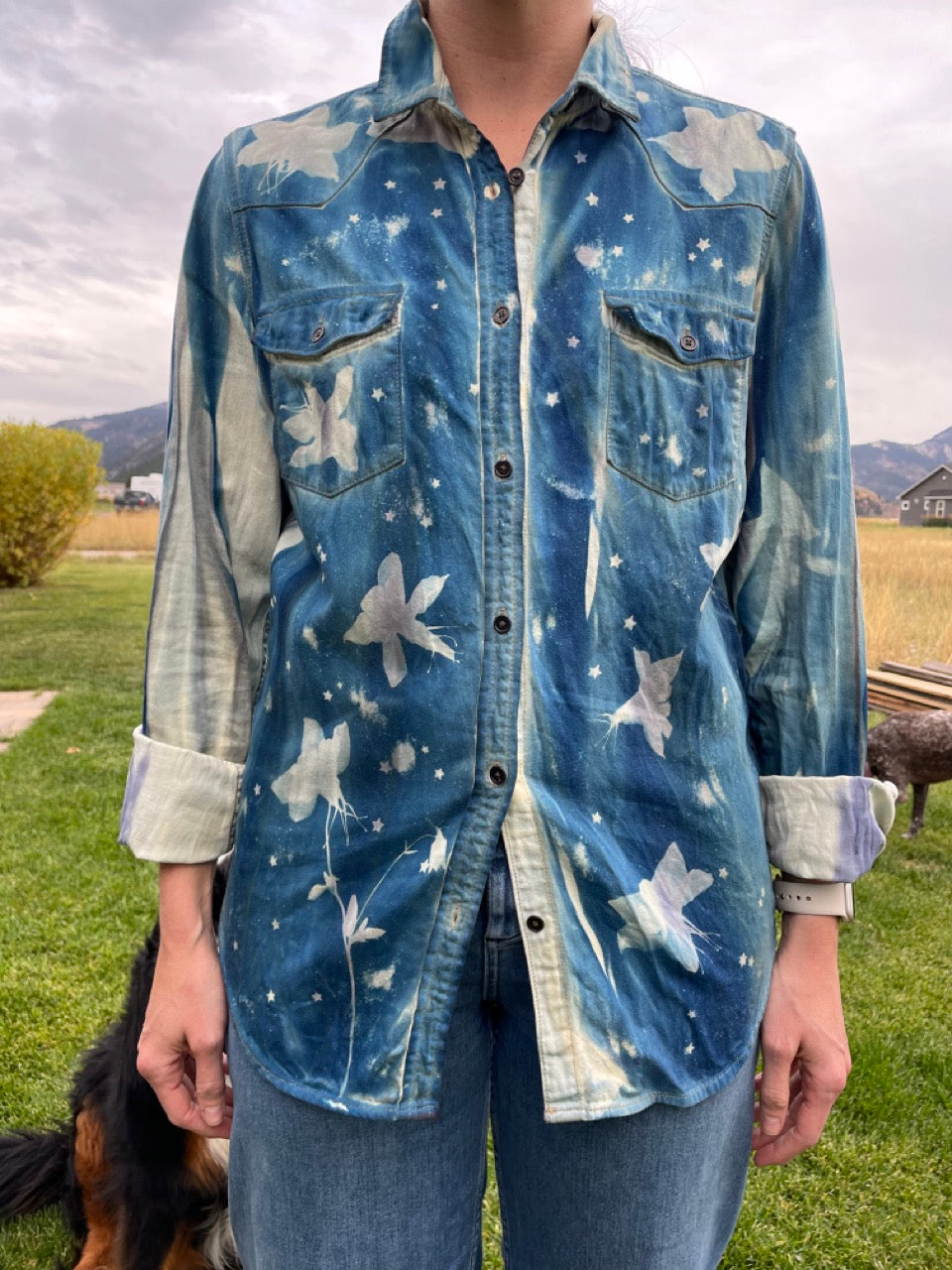 Secondhand fashion, redesigned using solar photography and beautiful wildflowers of Wyoming. This garment is one of a kind, upcycled, and sustainable.