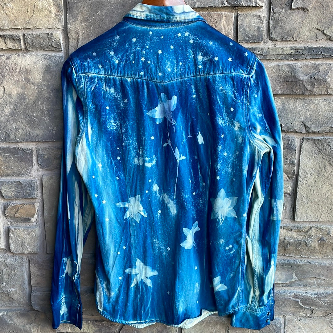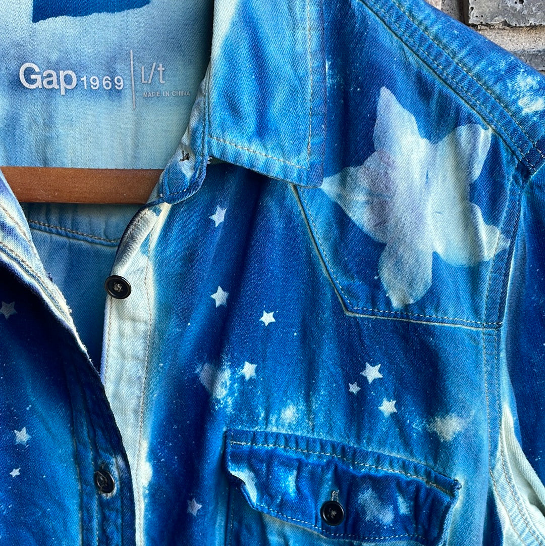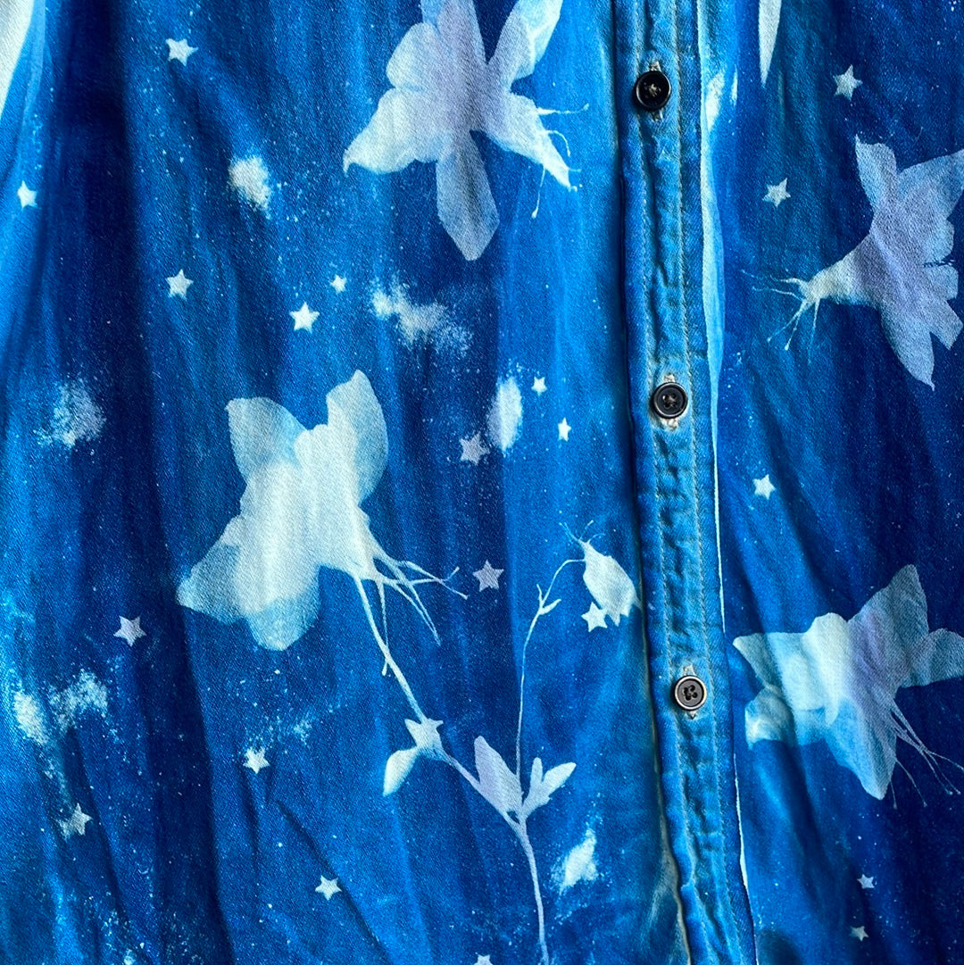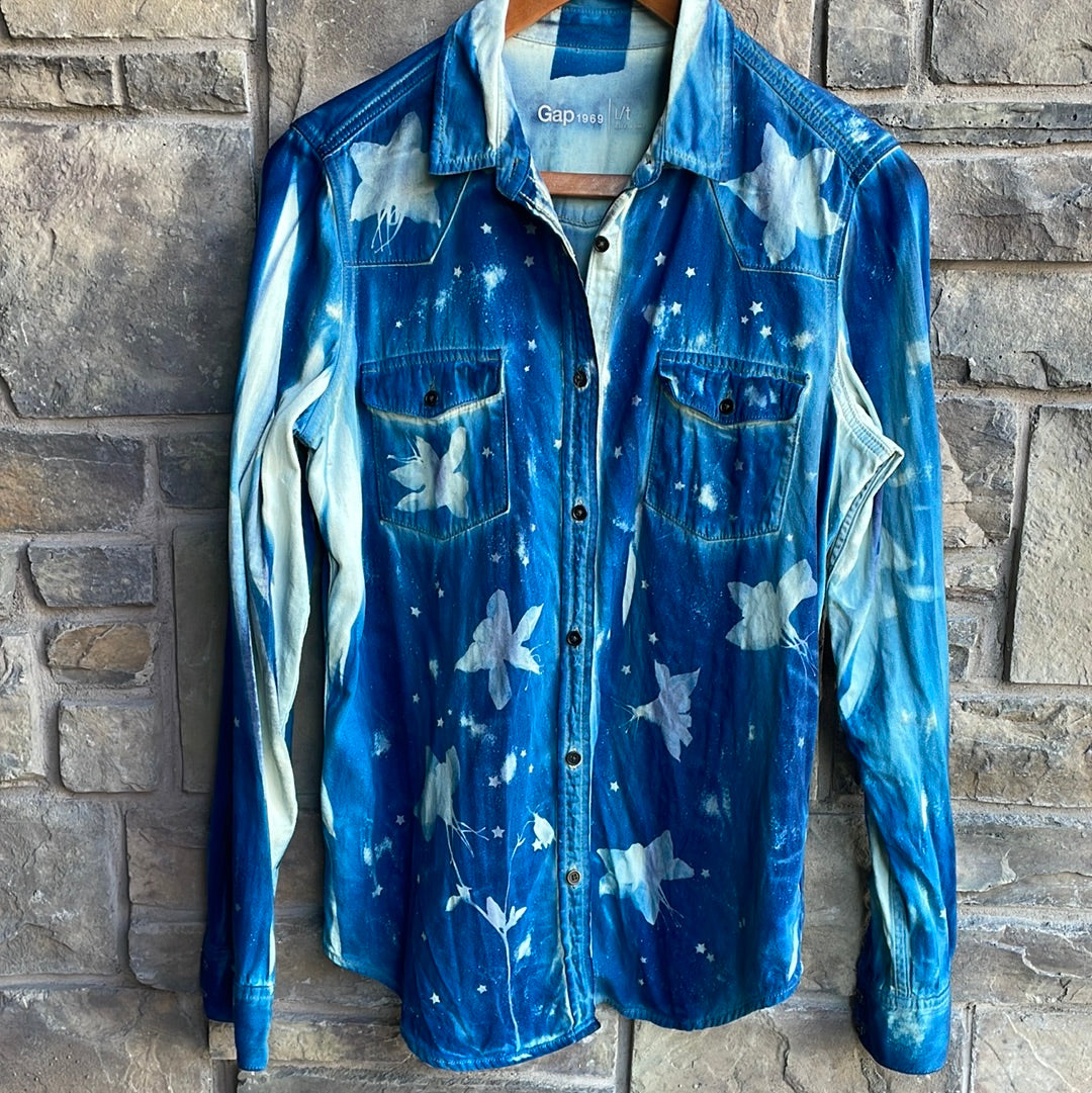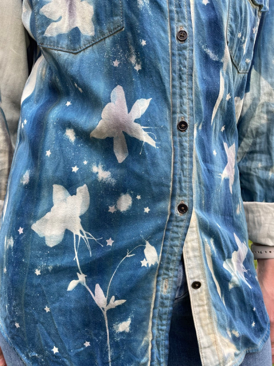 Caring for your clothing: Each cyanotype garment is unique and requires such care. Turn inside out and hand wash with cold water when necessary. Do not use soaps or detergents containing phosphates, high PH solutions, or bleach--these products can cause discoloration and fading. If needed, washing in a diluted bath of hydrogen peroxide can help restore to original blue.