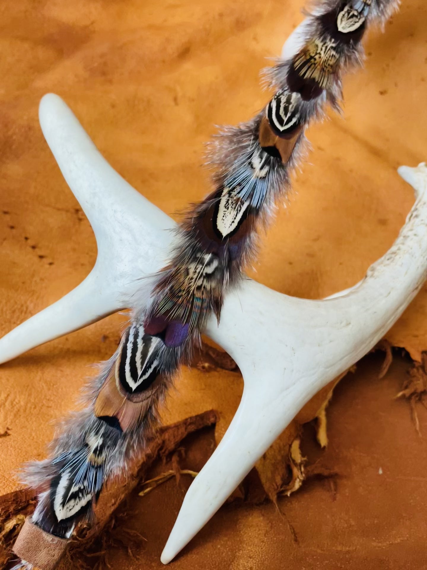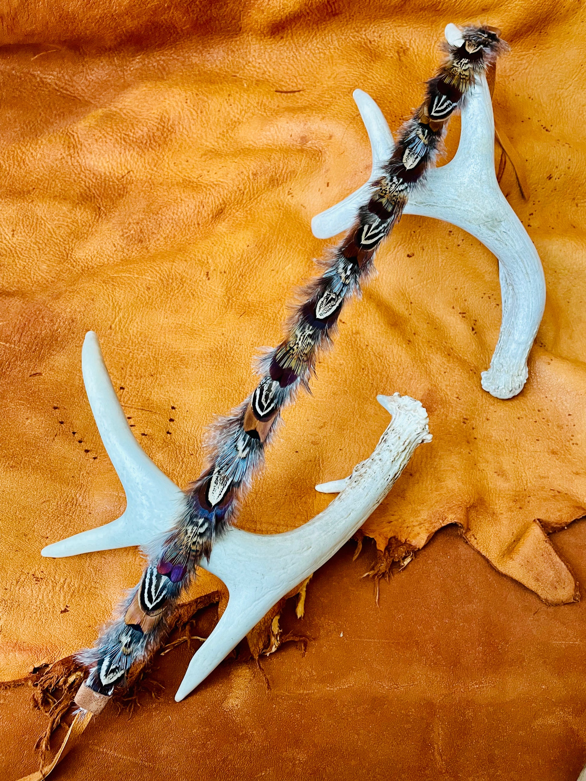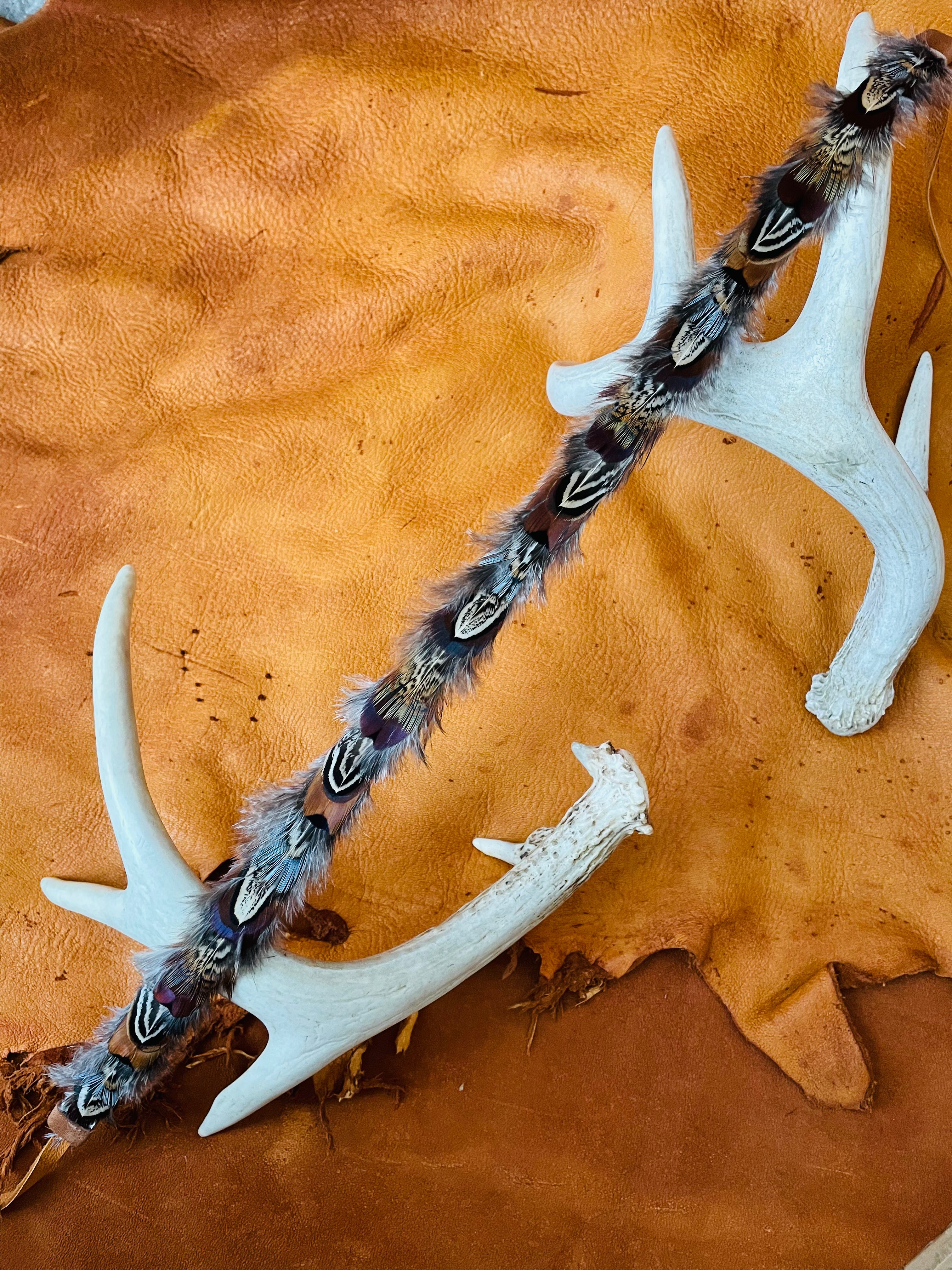 Handcrafted in small batches, this hat band is made from ethically sourced Rooster Pheasant feathers and is finished with deer skin leather ties. Rooster Pheasants have a full spectrum of colorful plumage and this hat band boasts a wild arrangement of a variety of their feathers. Colors include gold, blue, green, maroon, and more.