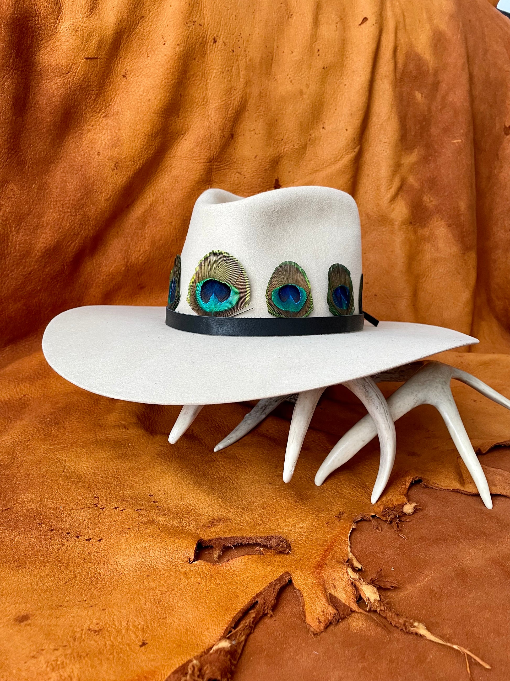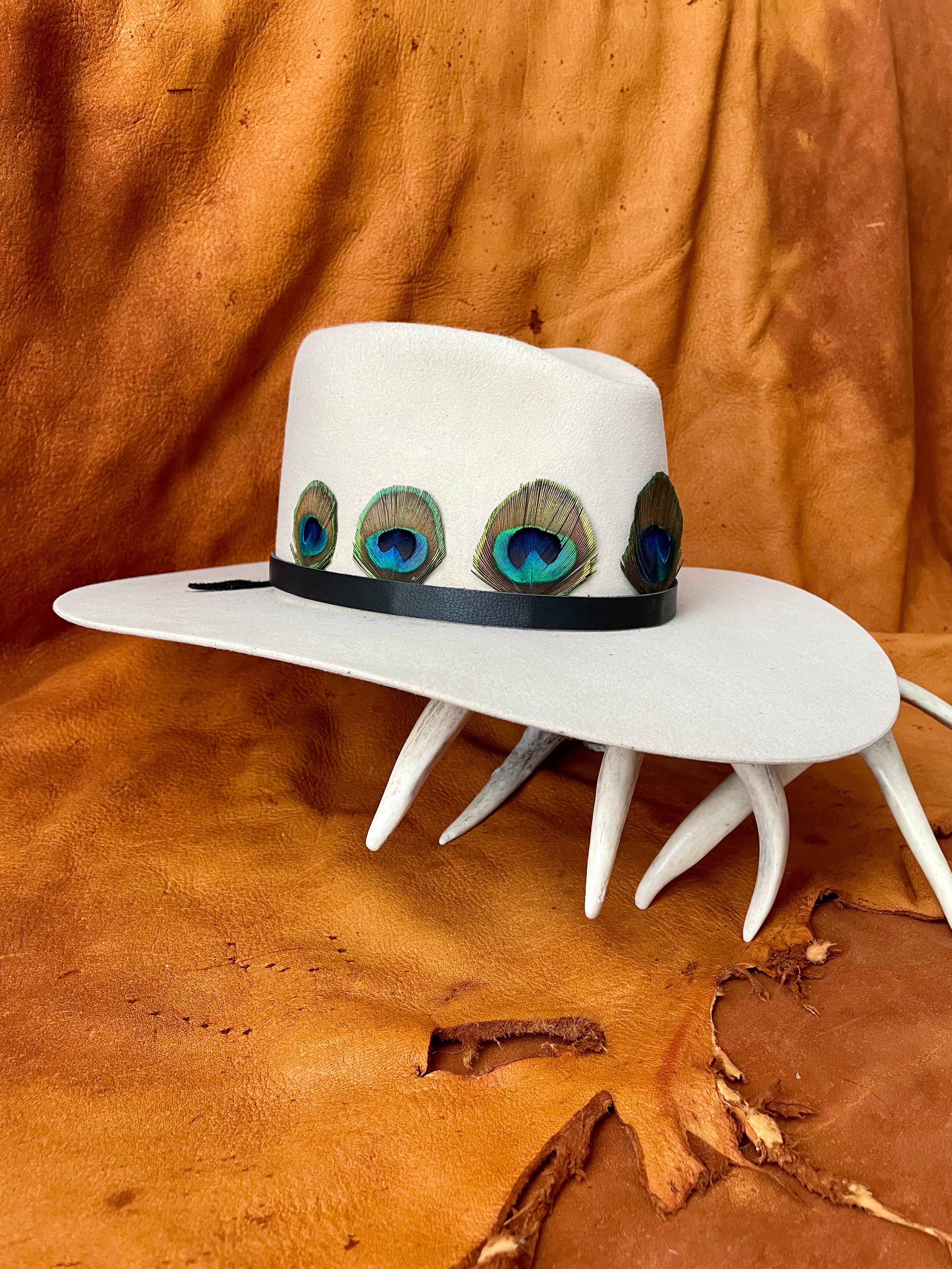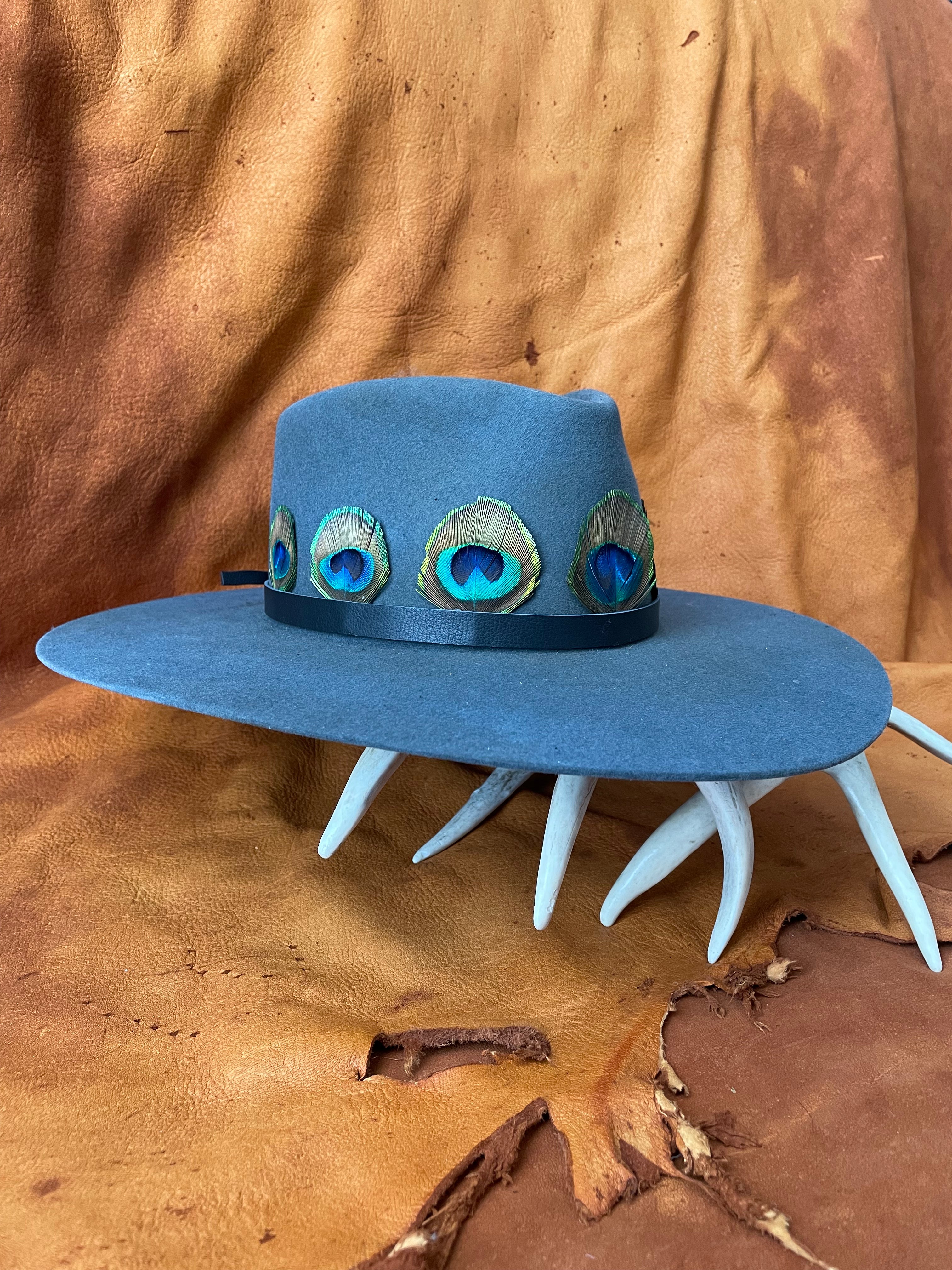 Handcrafted in small batches, this hat band is made from salvaged peacock feathers and is finished with deer skin lea...