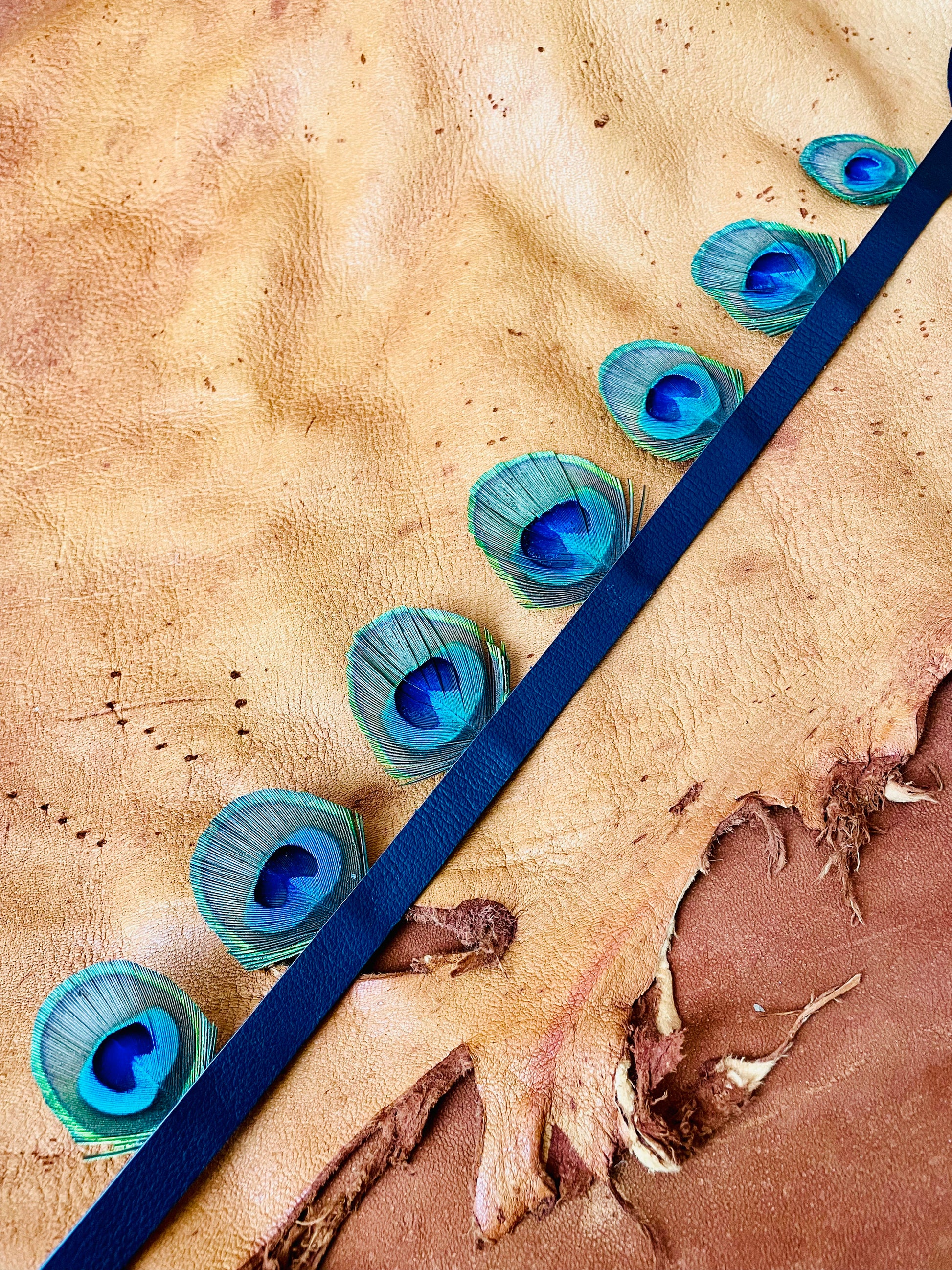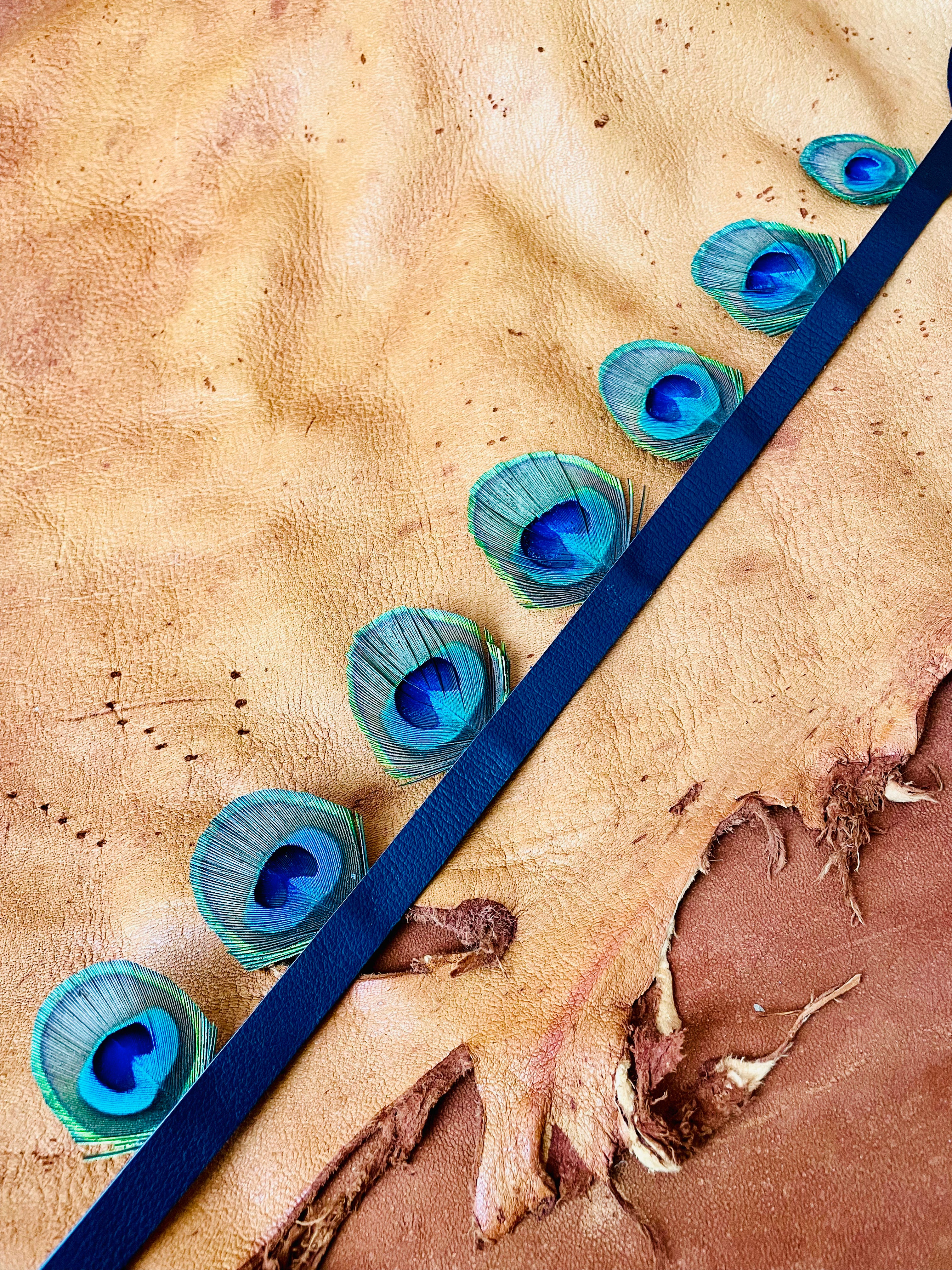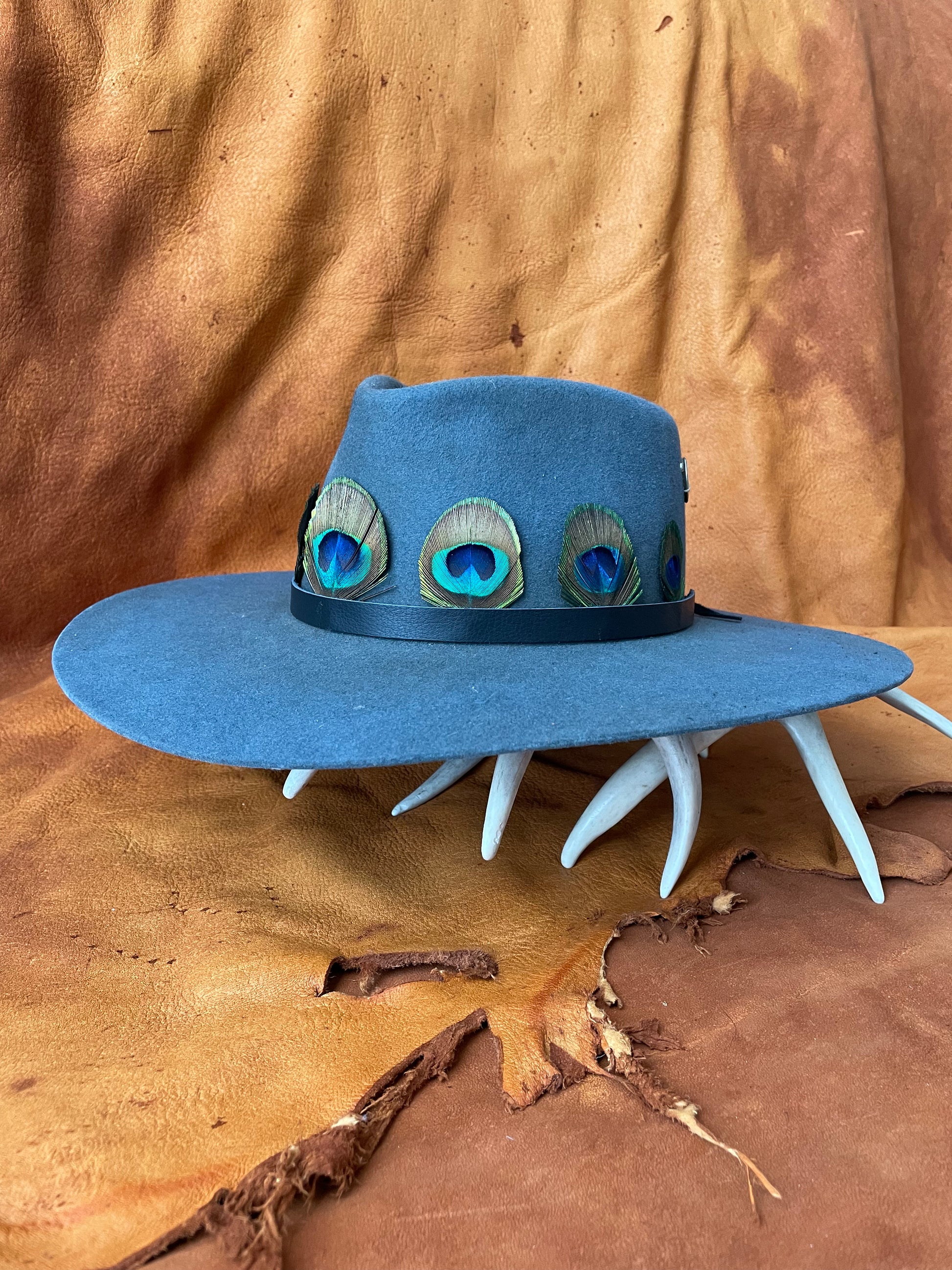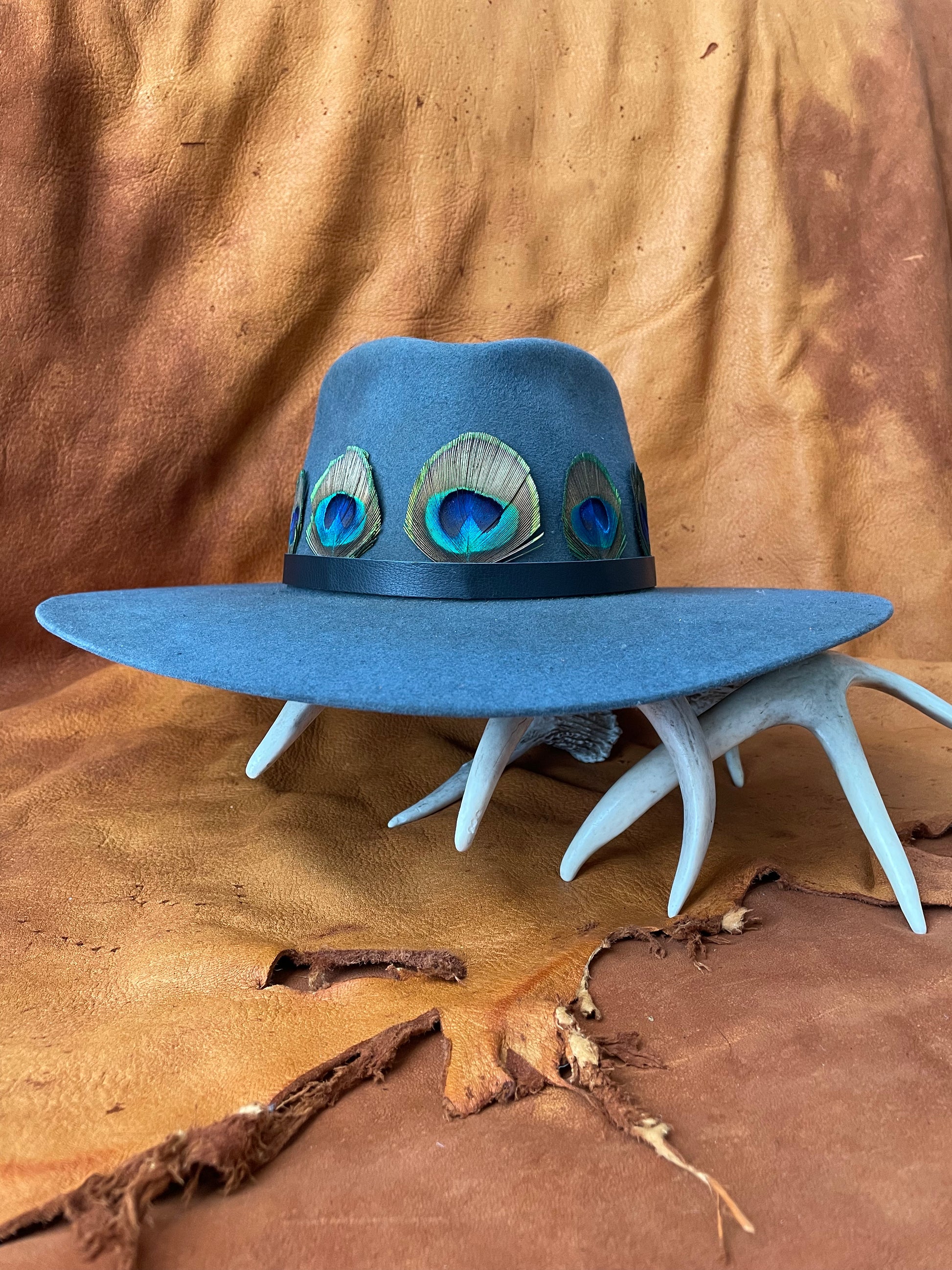 Handcrafted in small batches, this hat band is made from salvaged peacock feathers and is finished with deer skin lea...