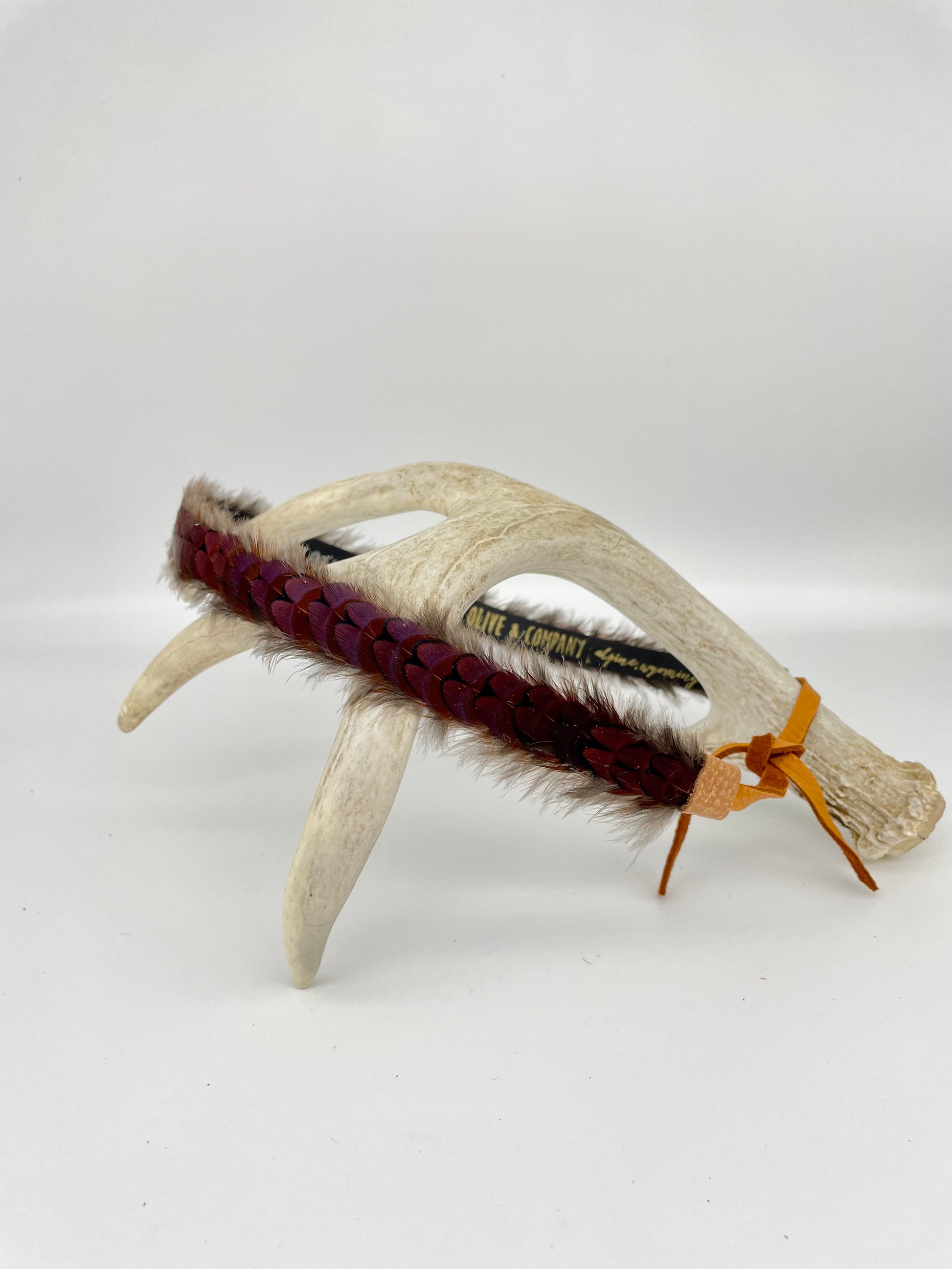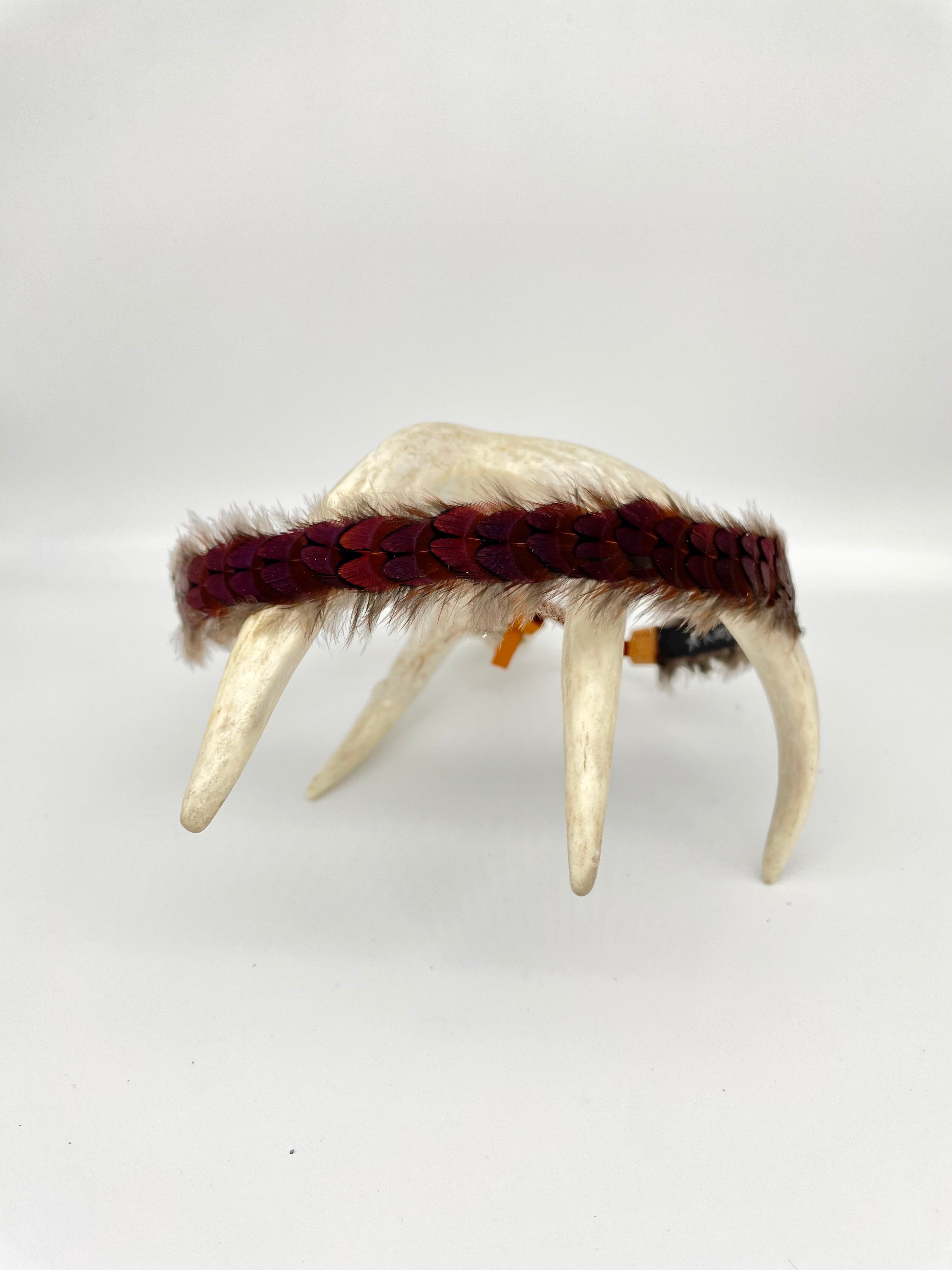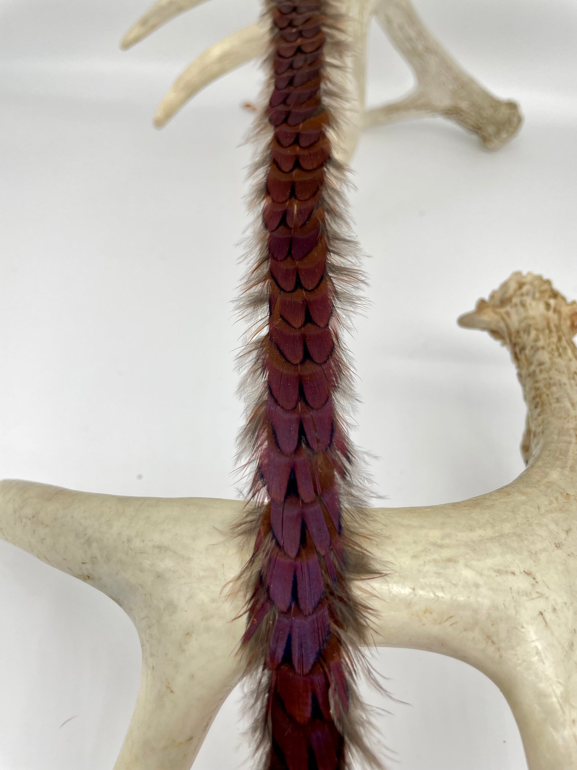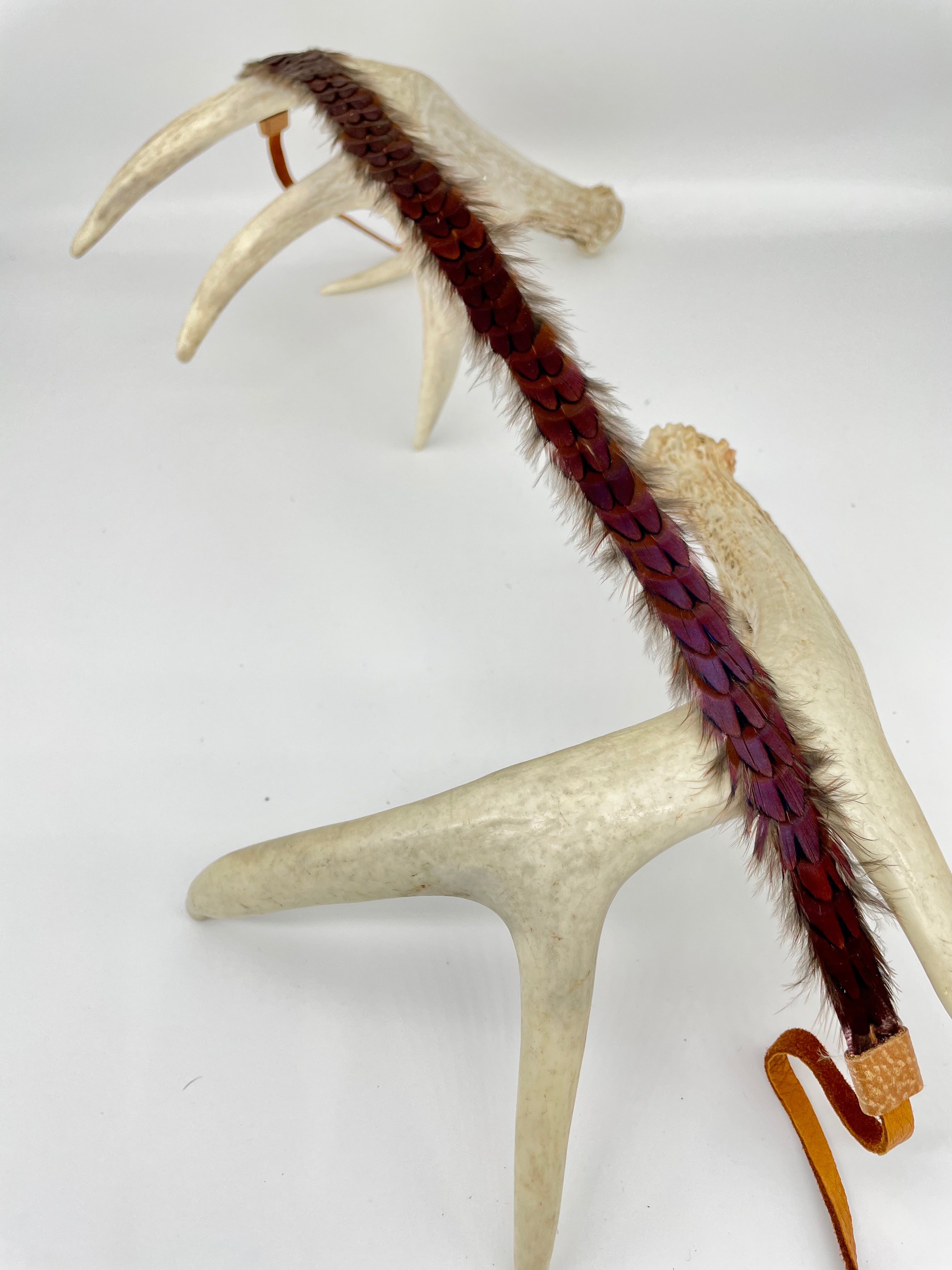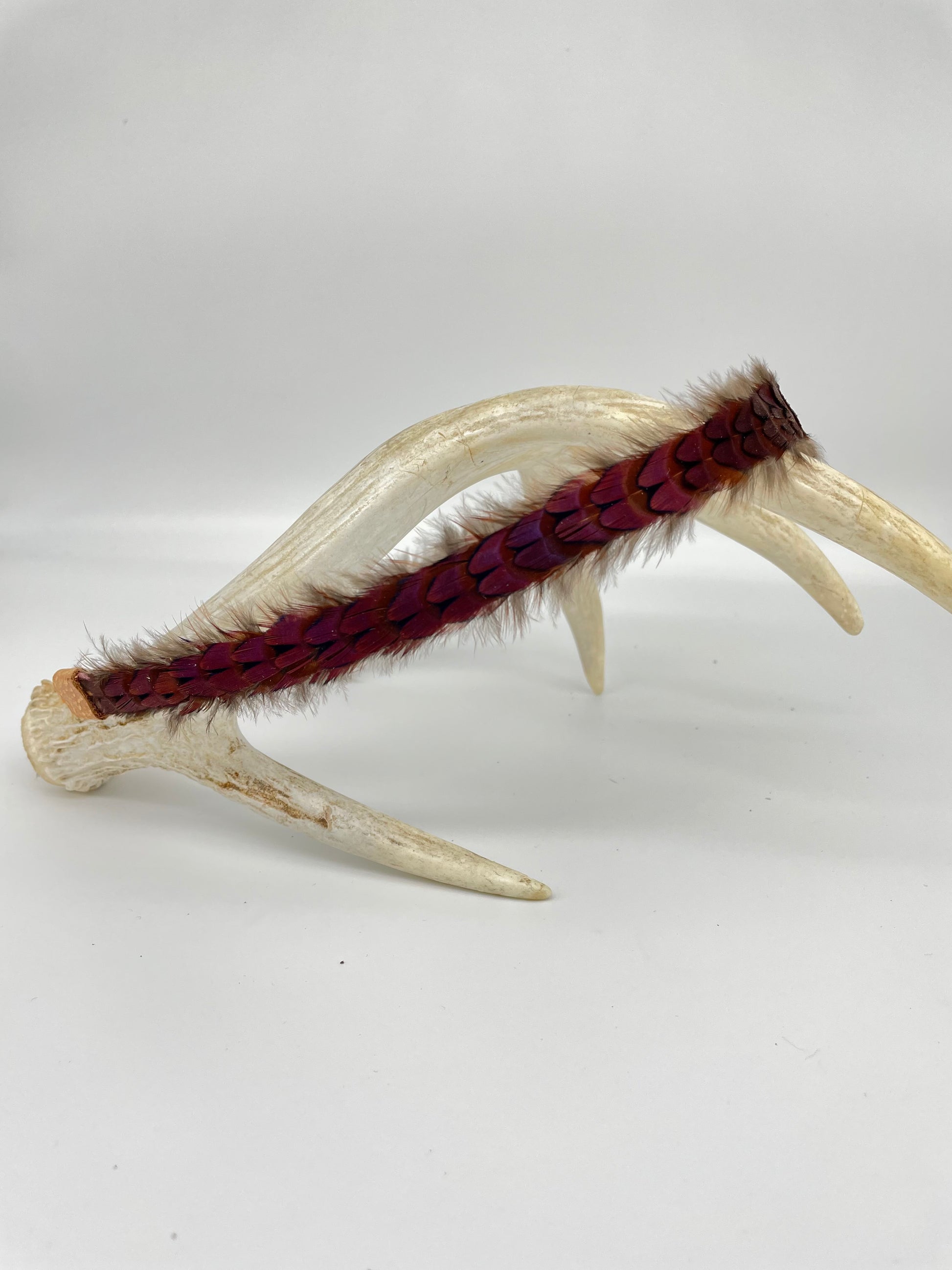 Handcrafted in small batches, this hat band is made from ethically sourced Rooster Pheasant feathers and is finished with deer skin leather ties. Rooster Pheasants have a full spectrum of colorful plumage and this hat band boasts beautiful feathers of magenta-- in the light the colors shift from purple to a glowing maroon. Each hat band is unique, no two birds are the same.